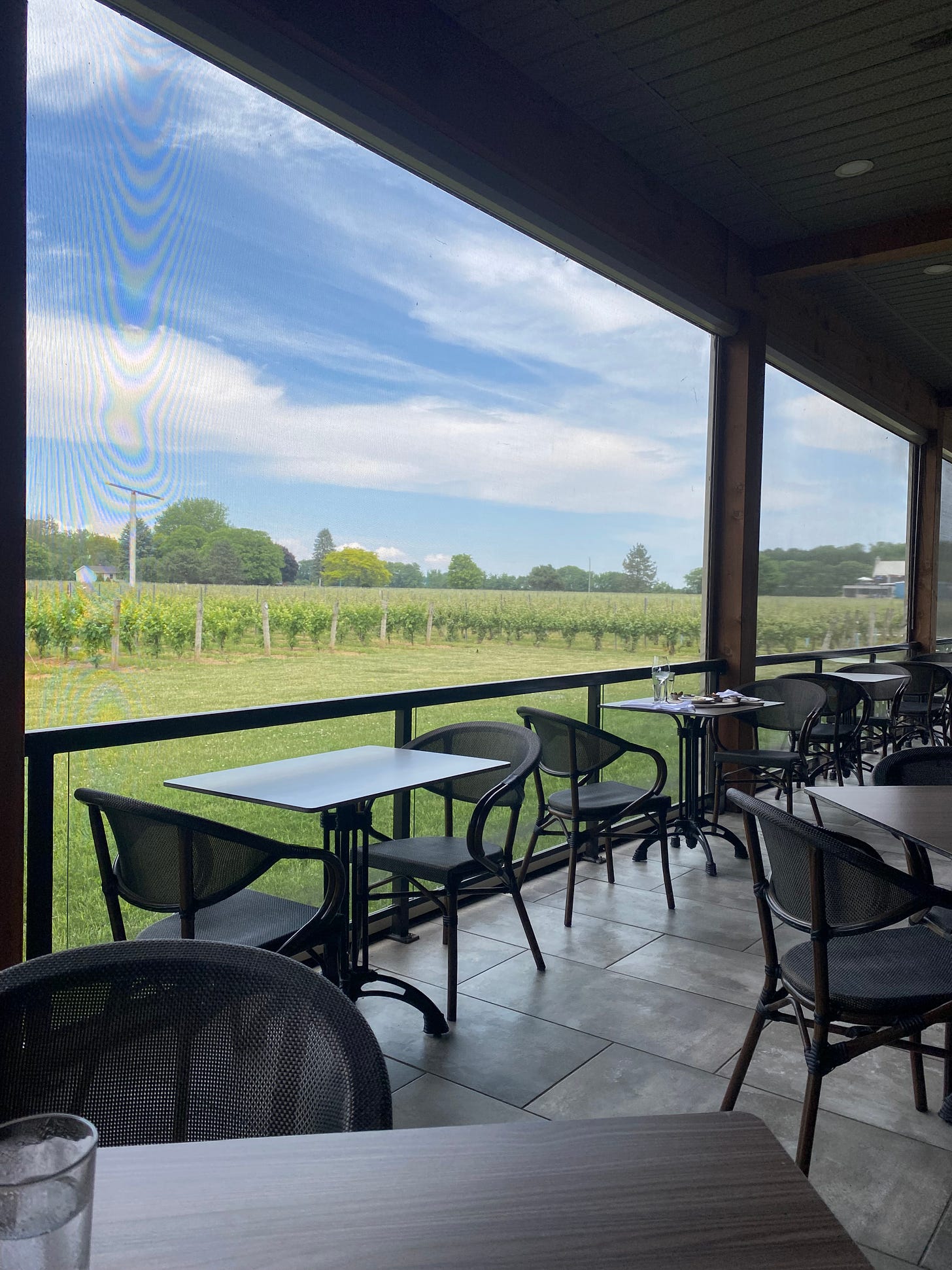 The first winery we visited was called CREW: Colchester Ridge Estate Winery. I had a nice wine flight of 4 different varieties of white while hubby opted for a flight of all red wines. The food was good, too. We shared chicken, bacon and cheese egg rolls for a starter. Then we split a delicious Reuben sandwich and fries. The waitress Regan and the waiter Noah were very friendly. Here was the lovely view of part of their vineyard from their screened-in back porch.